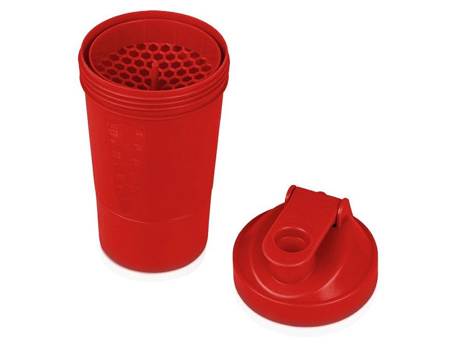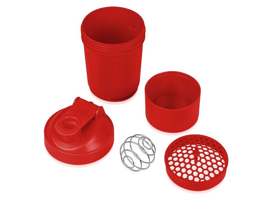 Шейкер для спортивного питания - это один из необходимых аксессуаров для спортсменов и людей, ведущих активный образ жизни. В нем можно приготовить протеиновый коктейль или фруктовый напиток. Шейкер классической формы, он удобно лежит в руке, к донышку прикручивается емкость для смешивания (таблетница), в которой можно хранить спортивные добавки: протеиновый порошок, витамины и другие концентраты. Внутри колбы имеется пластиковая сетка, чтобы процеживать спортивный напиток, а также металлический размешиватель, который растворяет порошок в напитке без комочков. Объем - 400мл. Шейкер изготовлен из пищевого пластика, он герметичен и легко моется.