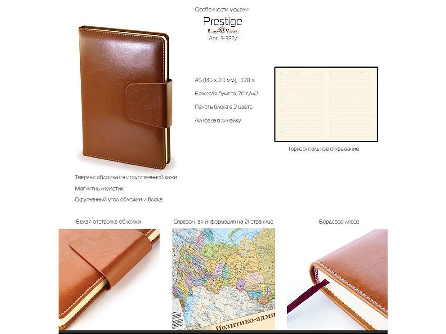 В ежедневнике «Prestige» есть полезная справочная информация на русском языке, а также страницы для записи идей, мыслей и составления рабочих планов. Дни недели указаны сокращенно на английском языке. Для изготовления страниц используется качественный бежевый офсет повышенной плотности (70 г/кв м), который производится в Японии и подходит для всех видов чернил. Разметка блока с указанием времени позволяет планировать дела с точностью до 1 часа.