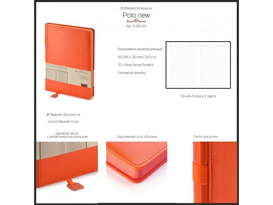 В ежедневнике «Polo» есть полезная справочная информация, а также 320 страниц для записи идей, мыслей и составления рабочих планов. Для изготовления страниц используется качественный бежевый офсет повышенной плотности (70 г/кв м).