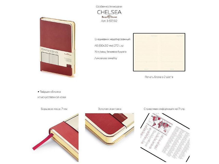 В ежедневнике «Chelsea» есть полезная справочная информация и телефонная книга, а также 272 страницы для записи идей, мыслей и составления рабочих планов. Есть закладка - тесьма из шелка, она интегрирована в обложку и может использоваться как хлястик. Для изготовления страниц используется качественный бежевый офсет повышенной плотности (70 г/кв м), которая производится в Японии и подходит для всех видов чернил. Бордовое ляссе, совпадающее по цвету с капталом, служит для удобного перехода к текущей дате.