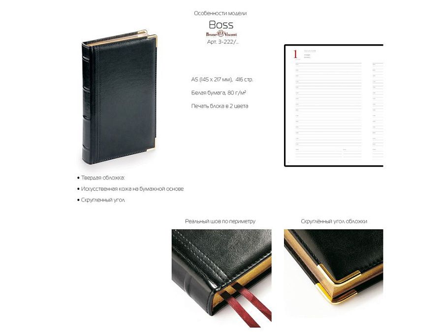 Классический деловой ежедневник линии Boss – образец элегантности. Гладкую тонкую фактуру экокожи подчеркивает декоративная строчка по контуру и металлические закругленные уголки золотистого цвета.
