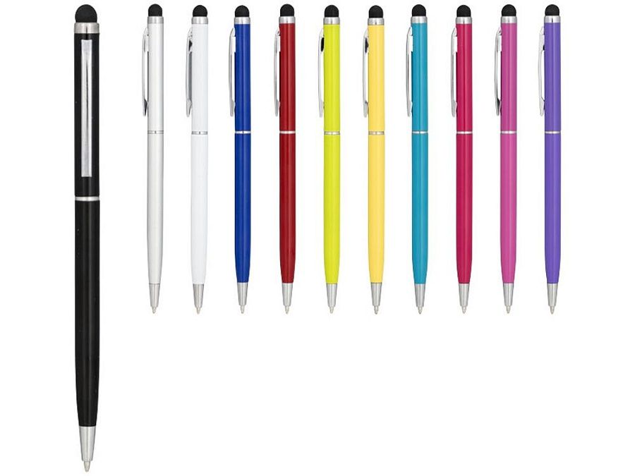 Алюминиевая шариковая ручка Joyce. Тонкая алюминиевая шариковая ручка с поворотным механизмом и стилусом. Алюминиевый корпус с металлическим зажимом и кольцом посередине, остальные элементы из пластика.