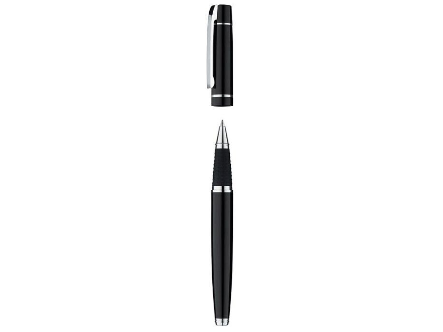 Металлическая ручка-роллер с пружинным клипом и нескользящей прорезиненной зоной захвата черного цвета. Фурнитура с глянцевой хромированной отделкой.
