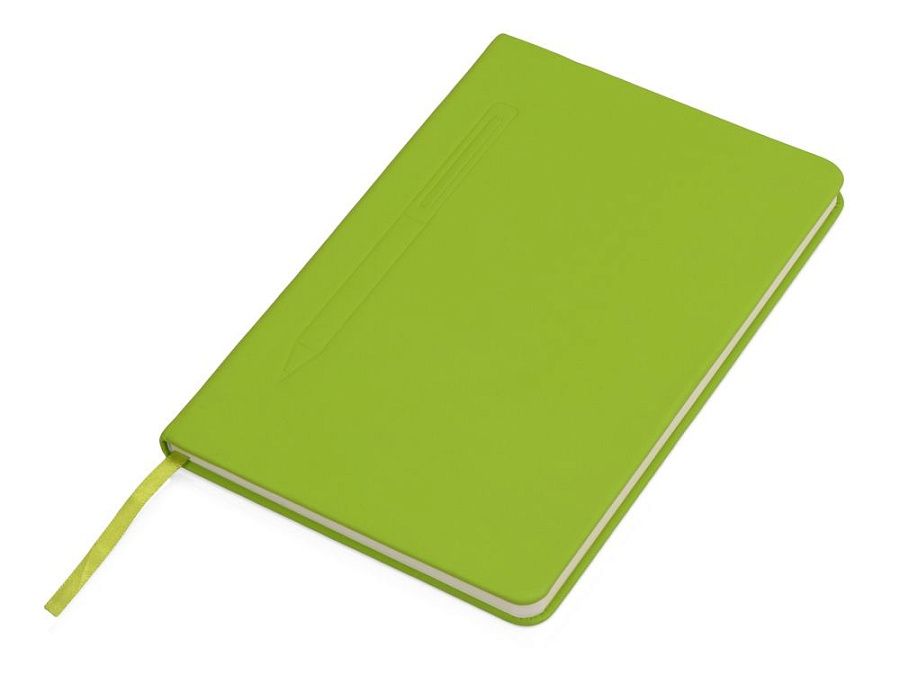Блокнот формата А5 в твердой обложке со скруглёнными углами и блоком в линейку на 80 листов. Благодаря скрытой магнитной ленте на блокноте можно легко и надежно закрепить металлическую ручку. Зона с магнитом обозначена тиснением в форме ручки.
