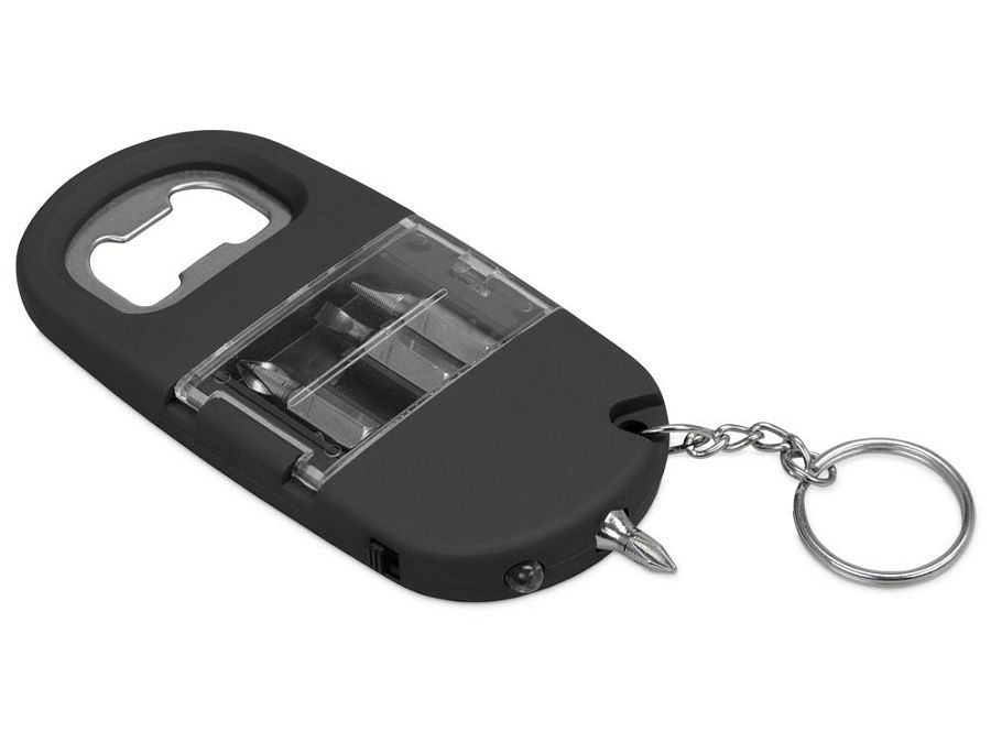 Брелок включает в себя 2 плоские и 2 крестообразные насадки, прочную металлическую открывалку и небольшой фонарик. Корпус сделан из плотного пластика с мягким покрытием soft-touch. Встроенный фонарик позволяет подсвечивать рабочую зону.