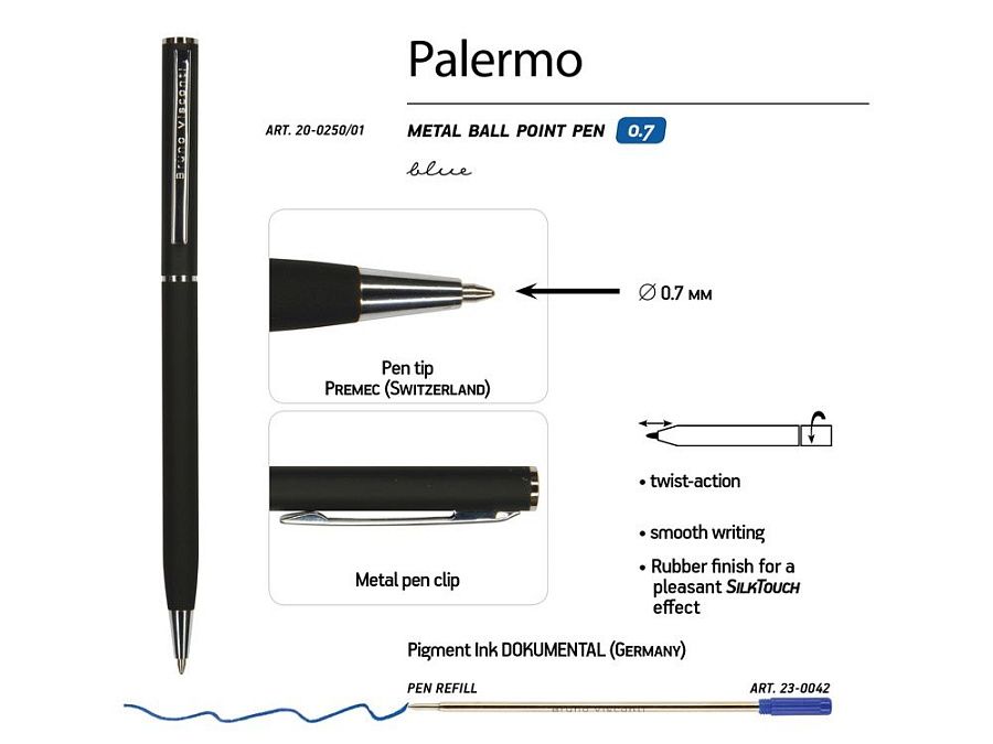 Автоматическая металлическая ручка "Bruno Visconti" серии "Palermo" однотонного цвета порадует любителей всего изящного и утонченного. Покрытие корпуса Soft Touch гарантирует дополнительный комфорт в работе с ней. Стержень легко выдвигается благодаря поворотному механизму. Синие пигментные чернила Dokumental (Германия) и пишущий узел Premec (Швейцария) обеспечивают качественное и мягкое письмо.