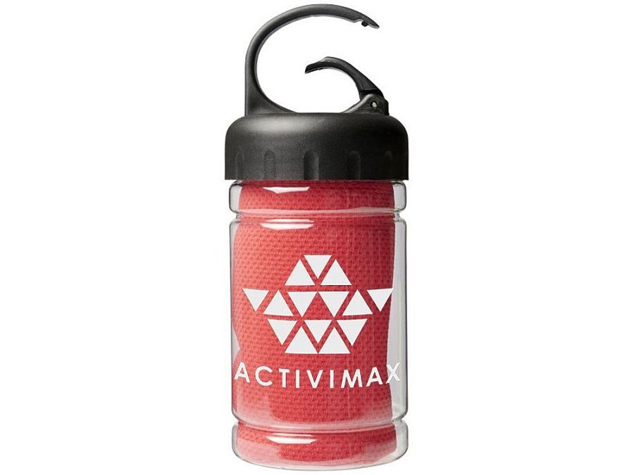Охлаждающее полотенце Remy в ПЭТ-контейнере. Быстро впитывающее, быстро сохнущее и стираемое охлаждающее полотенце сохраняет прохладу во время тренировок или любых других занятий на свежем воздухе. Поставляется в ПЭТ-контейнере с ручкой и встроенным карабином для удобной переноски. Доступно в 5 ярких цветах. На контейнере изображен большой логотип, он также может быть и на самом охлаждающем полотенце. Размер: 30 x 80 см. PET. 0,096.