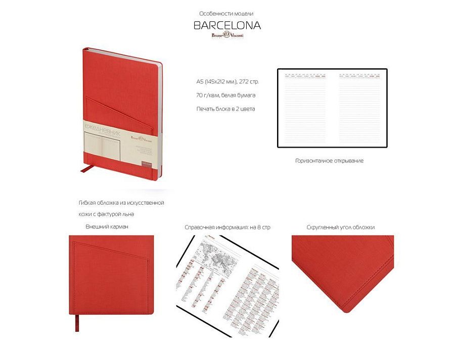 Это ежедневник предназначен для тех, кто отдает предпочтение строгости. Телефон, ручка, визитки и листы для записей будут всегда под рукой благодаря удобному карману на фронтальной стороне. В недатированном ежедневнике Barcelona черного цвета используется белая бумага плотность 70 г/м. Ляссе благородного бордового цвета сочетается с обложкой. Скругленный угол - фирменная особенность ежедневников Bruno Visconti. Справочная информация на 8 страницах. Ежедневник Barcelona упаковывается в картонный полукороб и термопленку.