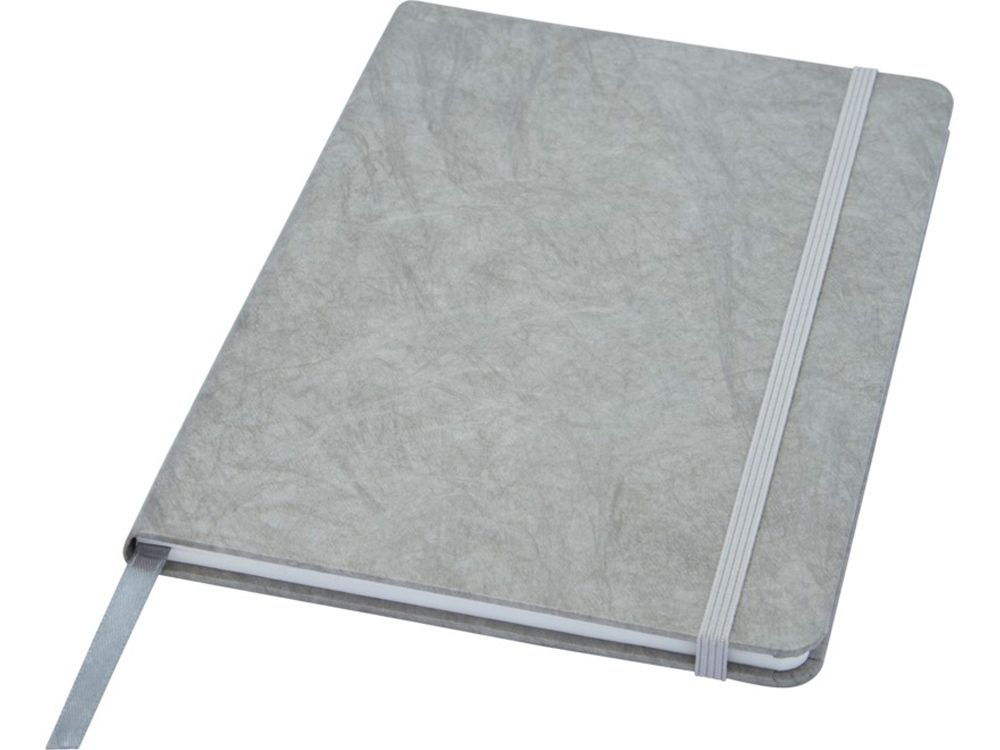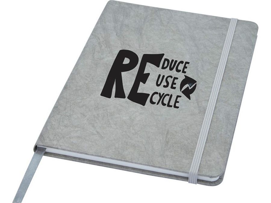 Устойчивый на разрыв блокнот формата A5 с внутренними страницами из каменной бумаги. В производстве каменной бумаги не используется дерево, а на сам процесс изготовления затрачивается гораздо меньше энергии в сравнении с производством переработанной или целлюлозной бумаги. Блокнот водонепроницаемый, поэтому вы сможете легко вытереть пролитую на него жидкость. Имеет ленту-закладку соответствующего цвета и эластичную резинку, а также 60 листов в линию плотностью 120 г/м², изготовленных из каменной бумаги. В упаковке из картона.