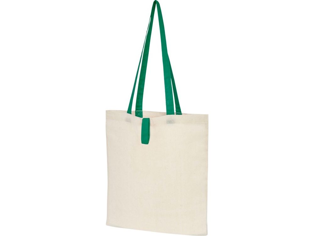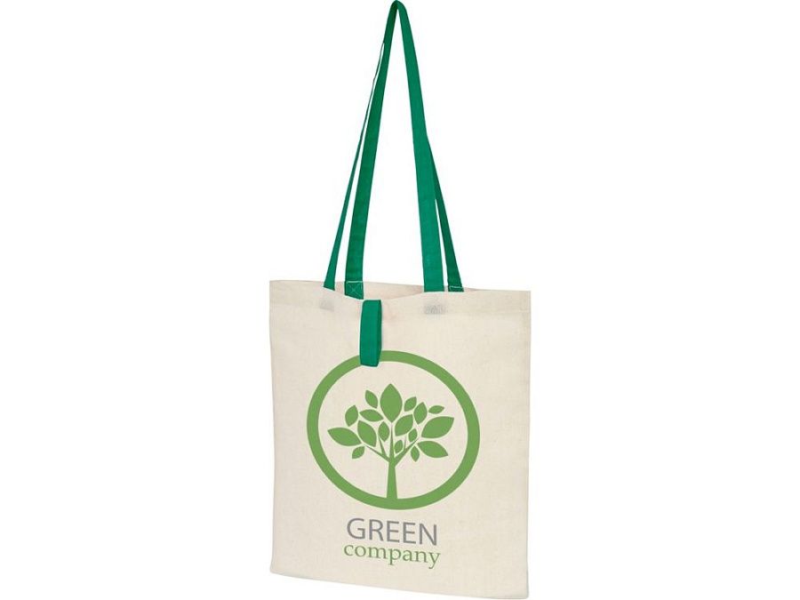 Эко-сумка с открытым основным отделением и цветными ручками, раскладывающаяся в высоту на 32 см. Имеет ремень с пуговичной застежкой, чтобы закрывать сумку. Прочность до 8 кг.