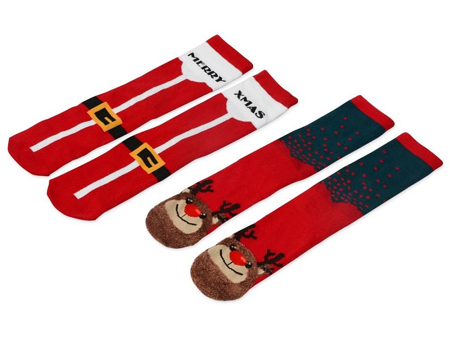 Рождественские носки прекрасно подойдут на роль подарка, который создает праздничное настроение. Этот набор состоит из двух пар, которые упакованы в мешочек из натурального хлопка. Одна пара украшена мягкими пушистыми мордочками рождественских оленей, а принт на второй изображает сапожки Санта Клауса. Ткань - смесь хлопка, полиэстера и спандекса, что обеспечивает носкам износостойкость, а мягкая широкая резинка – удобную посадку по ноге. Мешочек-упаковку можно брендировать по вашему желанию.