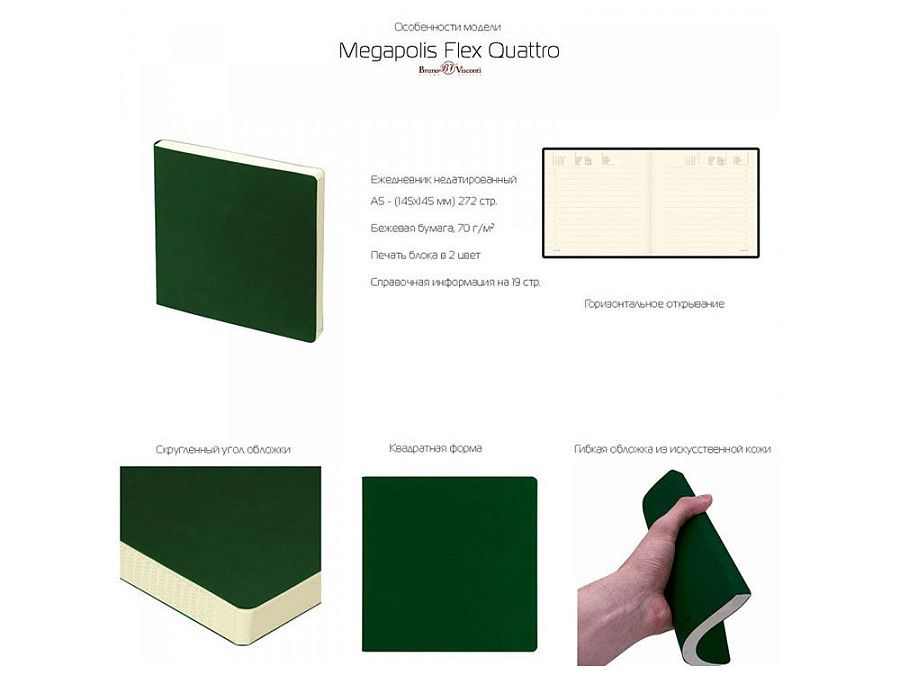 Оригинальный формат ежедневника Megapolis Flex Quattro никого не оставляет равнодушным. Большинство покупателей влюбляются в него с первого взгляда. Обложка выполнена из качественного, тактильно приятного искусственного материала, гибкая и не ломкая. Великолепная бежевая бумага плотностью 70 г/м и практичная линовка с расписанным временем для планирования дел. Этот ежедневник отлично поместится даже в маленькую сумку, а у всех, кто его увидит вызовет неподдельный восторг. Справочная информация на 19 страницах и телефонная книга на 28. Удобно, практично и, конечно же, стильно!