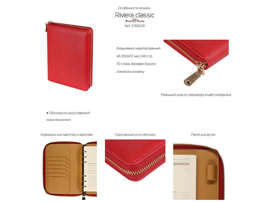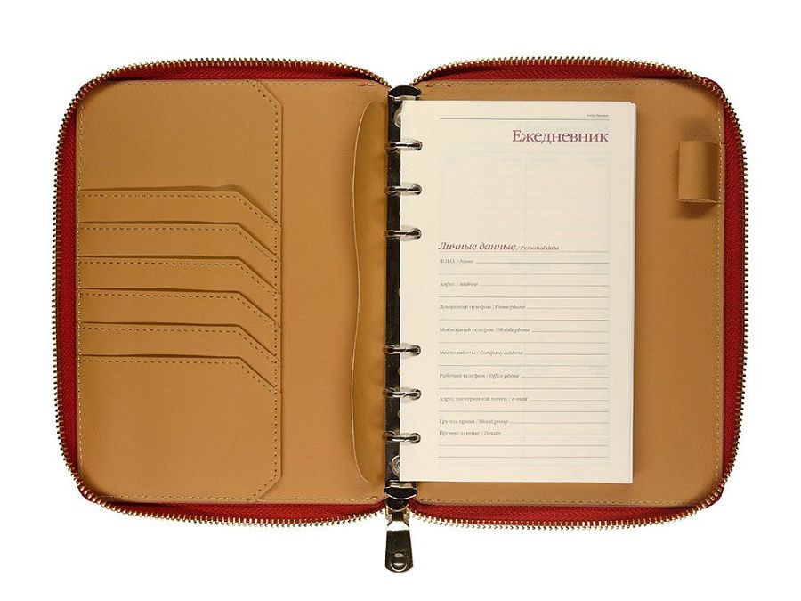 Великолепный ежедневник из качественной искусственной кожи, который заменит вам портмоне и органайзер. В ежедневнике предусмотрены карманы для карточек, сменный блок на кольцах. Внутри достаточно места для ручки и даже для мобильного телефона. Сам ежедневник закрывается на молнию. Его удобно брать с собой и на переговоры, и на деловой обед. Блок отпечатан в 2 цвета на бежевой бумаге плотностью 70 г/м2.