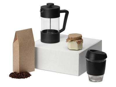 Набор "Бодрое утро" содержит все необходимое для действительно приятного пробуждения. В нем вы найдете все, что нужно для приготовления вашей первой чашечки кофе с утра: френч-пресс, упаковку робусты темной обжарки, стакан с силиконовыми деталями и баночку крем-меда, который составит прекрасную пару крепкому напитку. Набор упакован в белую картонную коробку и переложен бумажным наполнителем.