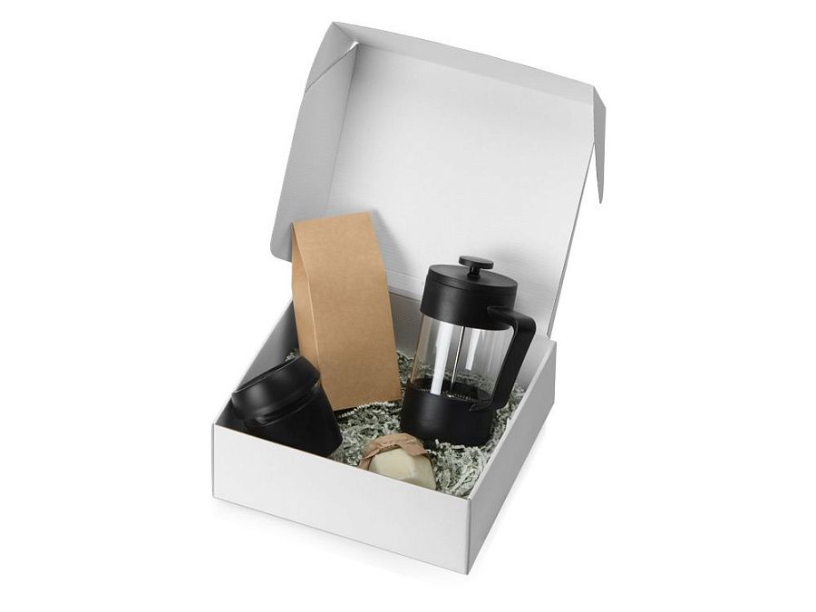 френч-пресс 600 мл, стеклянный стакан с силиконовой крышкой и манжетой 350 мл, кофе зерновой 100 г, бумажный наполнитель 50 г, подарочная упаковка 26,
