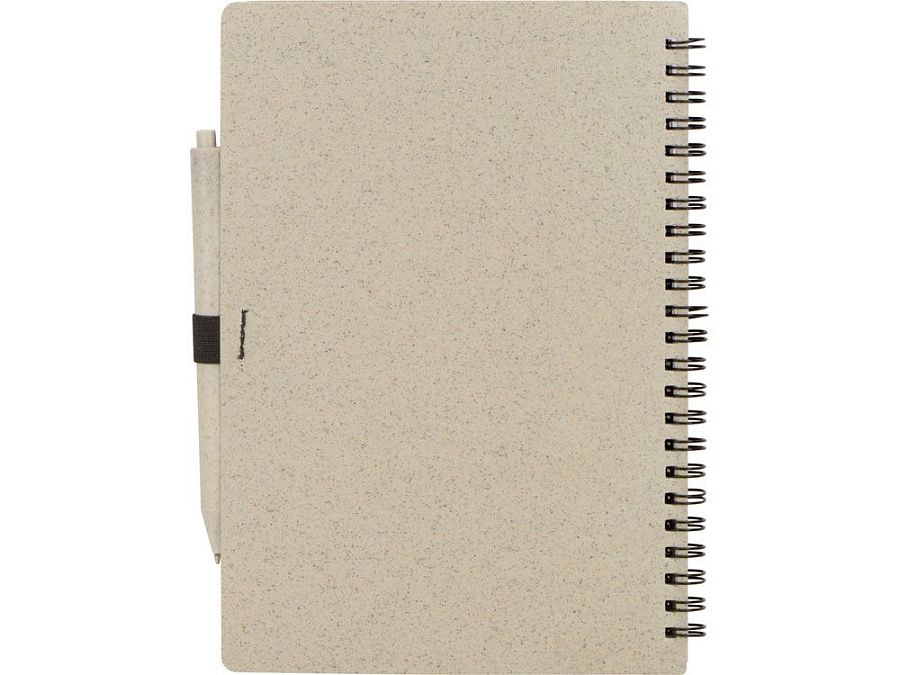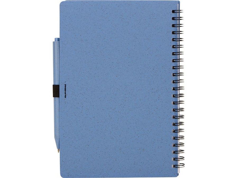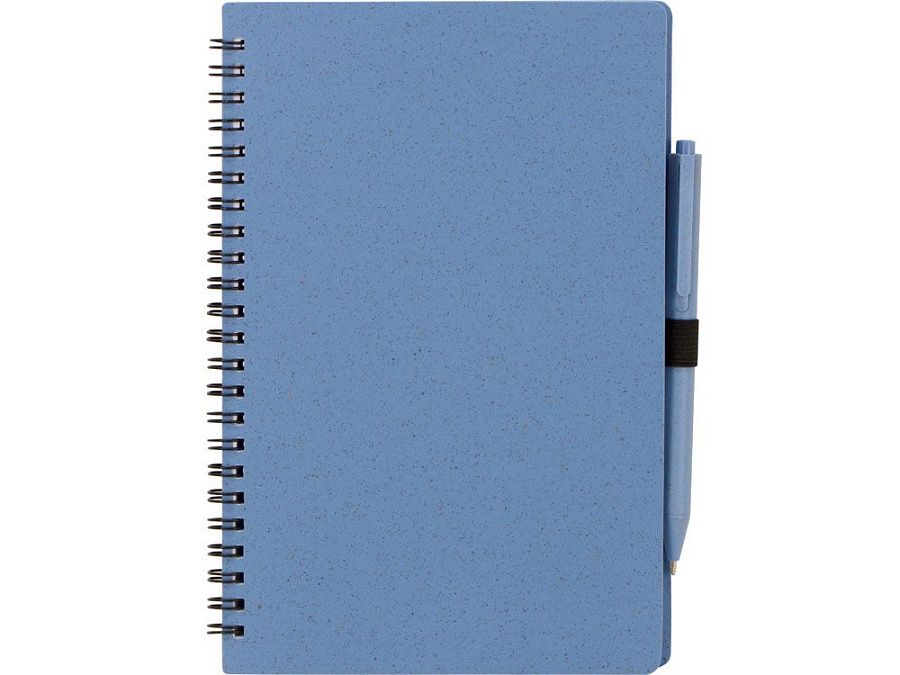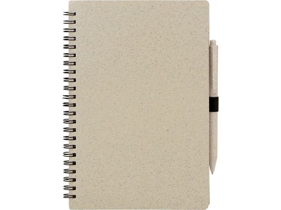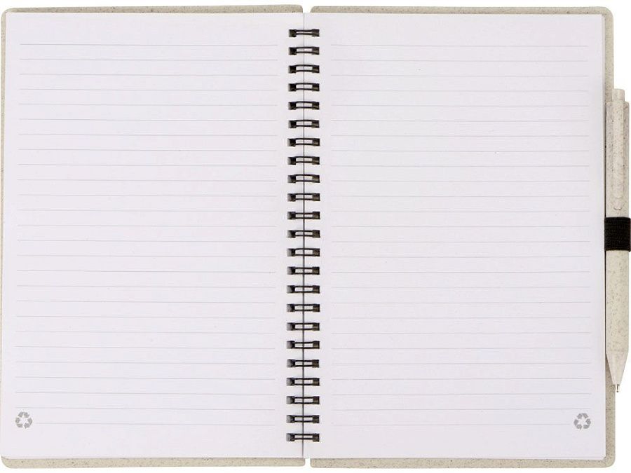 Блокнот с обложкой из переработанной пшеницы и пластика. Блок состоит из 80 листов переработанной бумаги белого цвета. Крепление - пружина. В комплекте шариковая ручка в тон блокноту из пшеничной соломы.