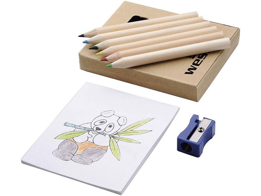 Оригинальный набор для рисования будет отличным промо-сувениром для любой акции креативного направления. Также отлично подойдет для продвижения дизайнерской студии. В наборе 6 цветных карандашей, точилка и раскраска. Комплект упакован в картонную коробку.