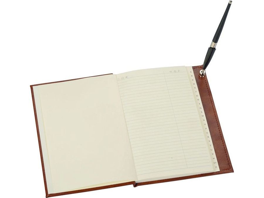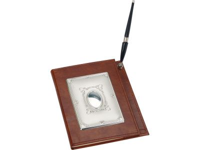 Оригинальный настольный прибор состоит из записной книжки и ручки. Обложка блокнота оснащена держателем для ручки и задекорирована изысканным украшением. Прибор станет настоящей настольной книгой руководителя.