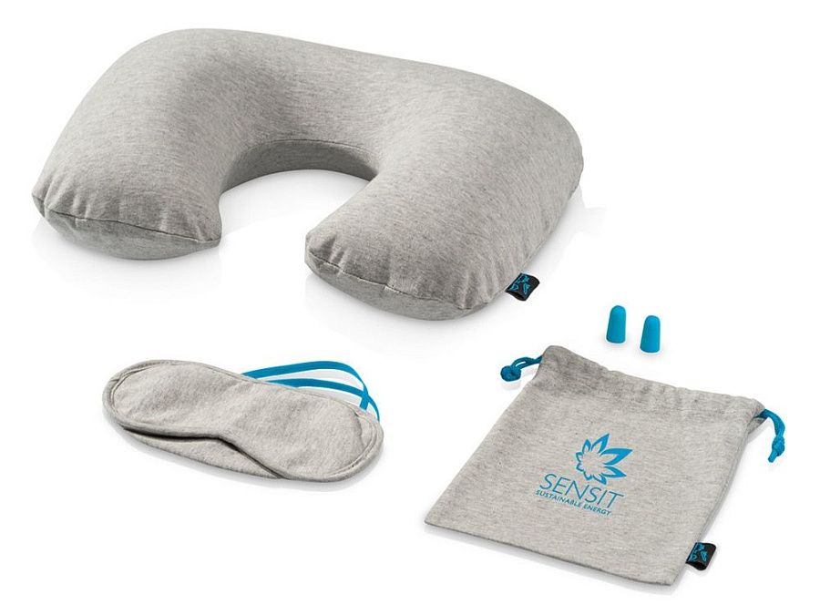 Дорожный набор Miami. Удобный дорожный набор включает надувную подушку с яркой молнией, маску для глаз с яркой резинкой и яркие беруши в мягком чехле с яркой кулиской. Джерси.