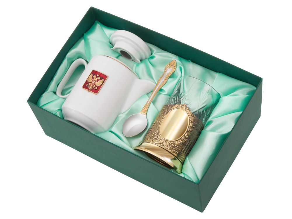 Чайный набор «ЭГОИСТ» - это идеальный подарок для ценителей русской культуры. Набор состоит из золотистого подстаканника, хрустального стакана, ложки и фарфорового чайника. Чайный набор совмещает в себе практическую пользу и традиционную эстетику.