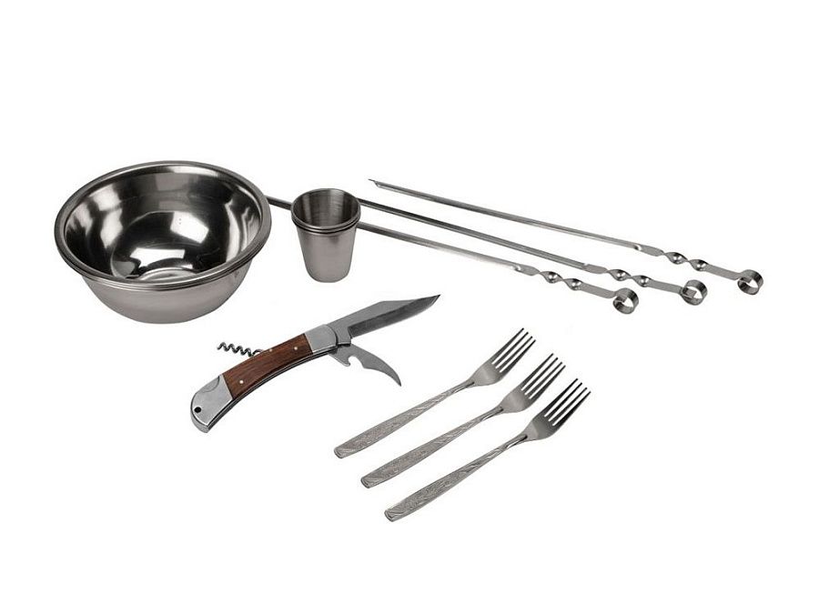 шампур- 3шт, миска 500мл- 3шт, вилка- 3шт, стопка 70мл- 3шт, нож многофункциональный