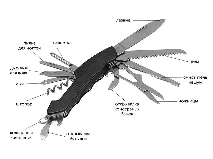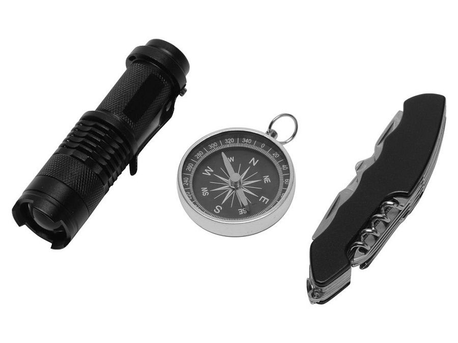 фонарик d2,4 х 9 см, компас d4,3 х 0,9 см, нож-мультитул 9,7 х 2,6 см (в сложенном виде)