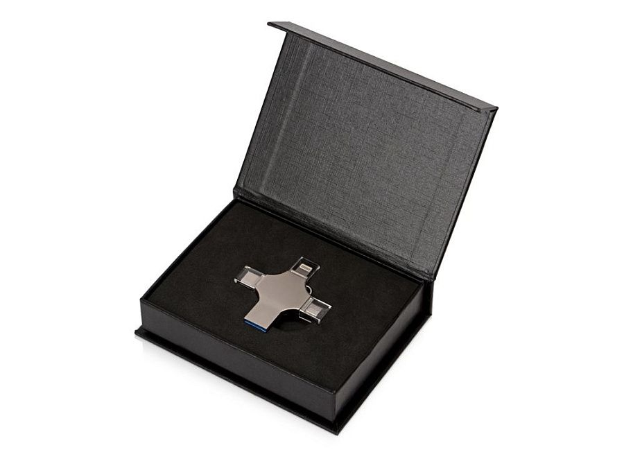 Универсальная быстрая флешка с большим объемом памяти (32 ГБ). Имеет 4 актуальных современных разъема: USB, micro USB, USB-C (Type-C) и Lightning. Теперь Вы всегда сможете быстро и безопасно обмениваться информацией с большинством современных устройств. Корпус из прочного алюминиевого сплава со специальным "ушком" для карабина. Поставляется в подарочной упаковке.