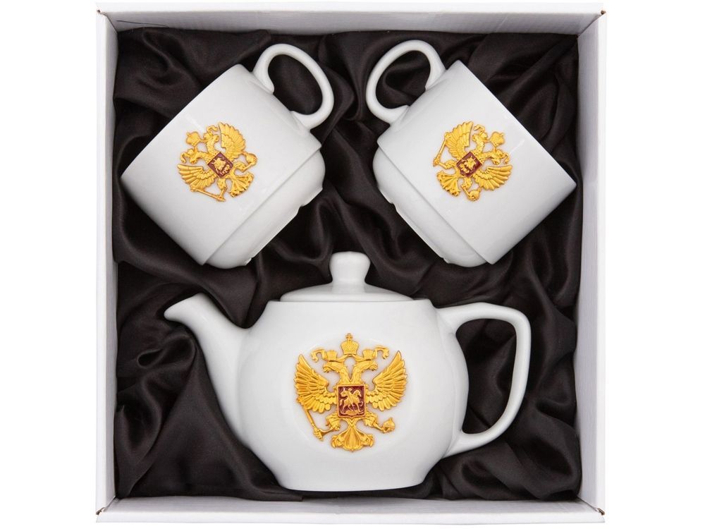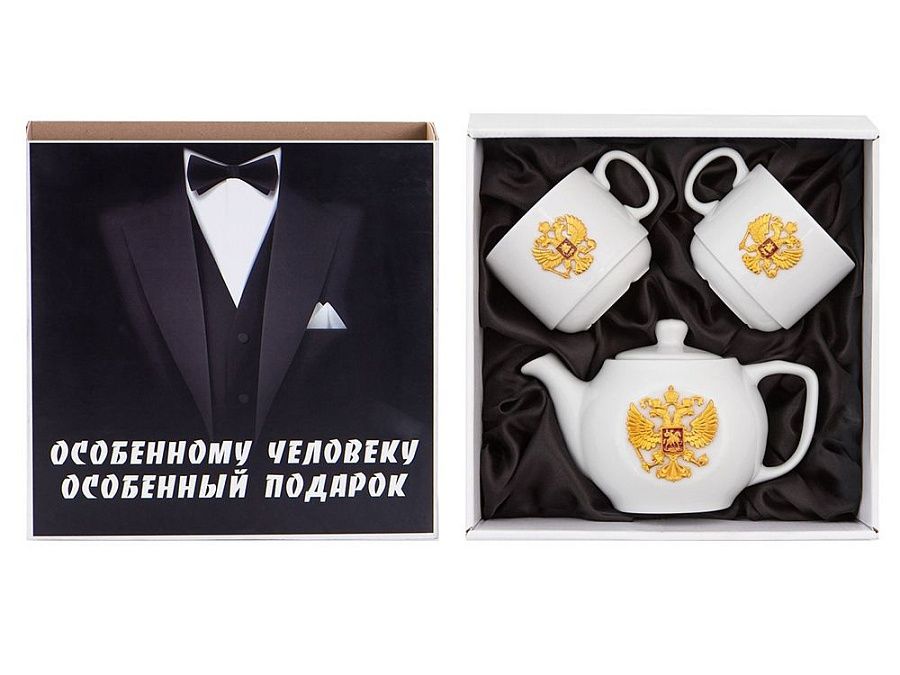 Фарфоровый чайник и две фарфоровые чайные кружки с чеканным металлическим декором «Двуглавый орел». Накладка изготовлена из алюминия методом чеканки с декоративной отделкой «под золото».
