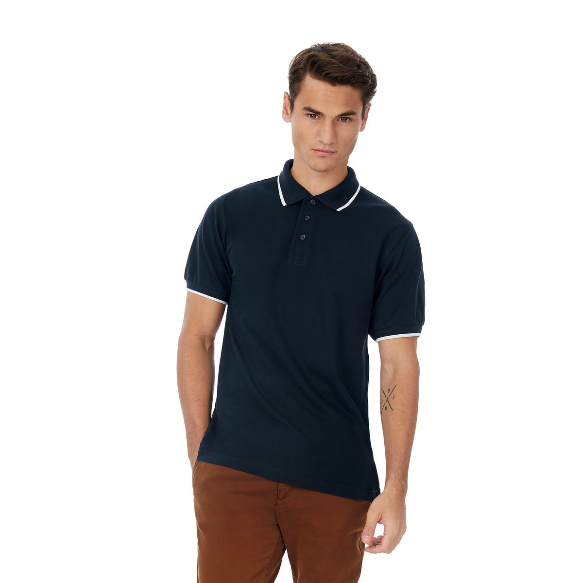 Рубашка поло из ткани пике, обработанной против усадки, плотностью 180 г/кв.м., усиленная планка на 3-х пуговицах в тон рубашки, воротник и манжеты связаны резинкой 1x1.