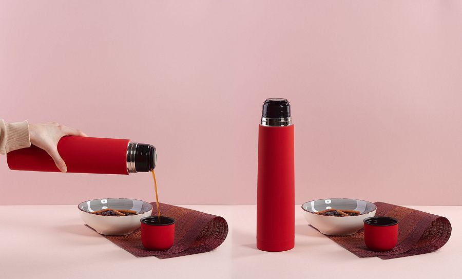 Внешняя стенка термостакана изготовлена из нержавеющей стали с уникальным прорезиненным напылением soft-touch, а внутренняя стенка выполнена из  высококачественной пищевой, нержавеющей стали. Корпус изделия персонализируется по окружности встык. Термос оснащен пробкой с клапаном, которая позволяет наливать напиток одним нажатием.
