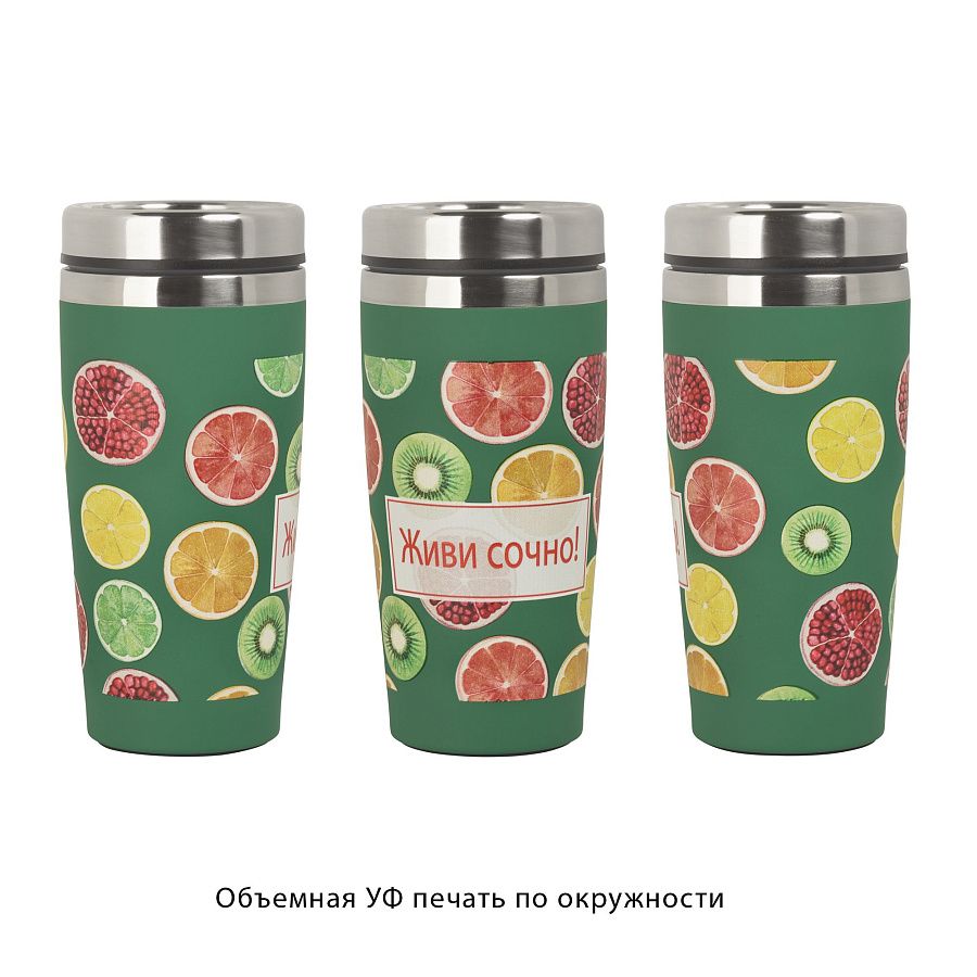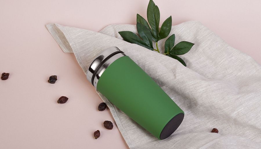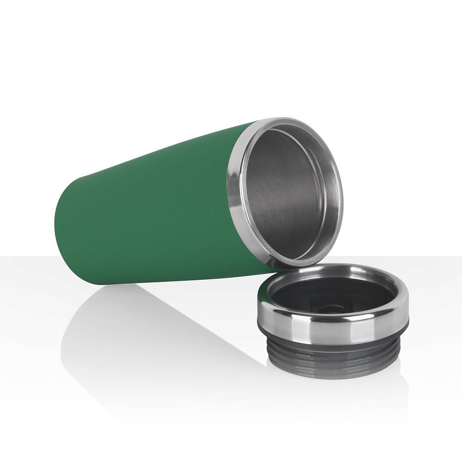 Внешняя стенка термостакана изготовлена из нержавеющей стали с уникальным прорезиненным напылением soft-touch, а внутренняя стенка выполнена из высококачественной пищевой, нержавеющей стали. Корпус изделия персонализируется по окружности встык. У термостакана отвинчивающаяся крышка.