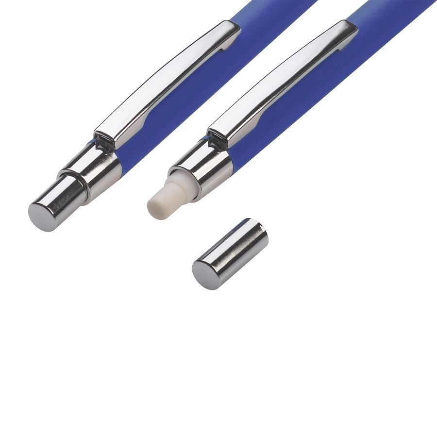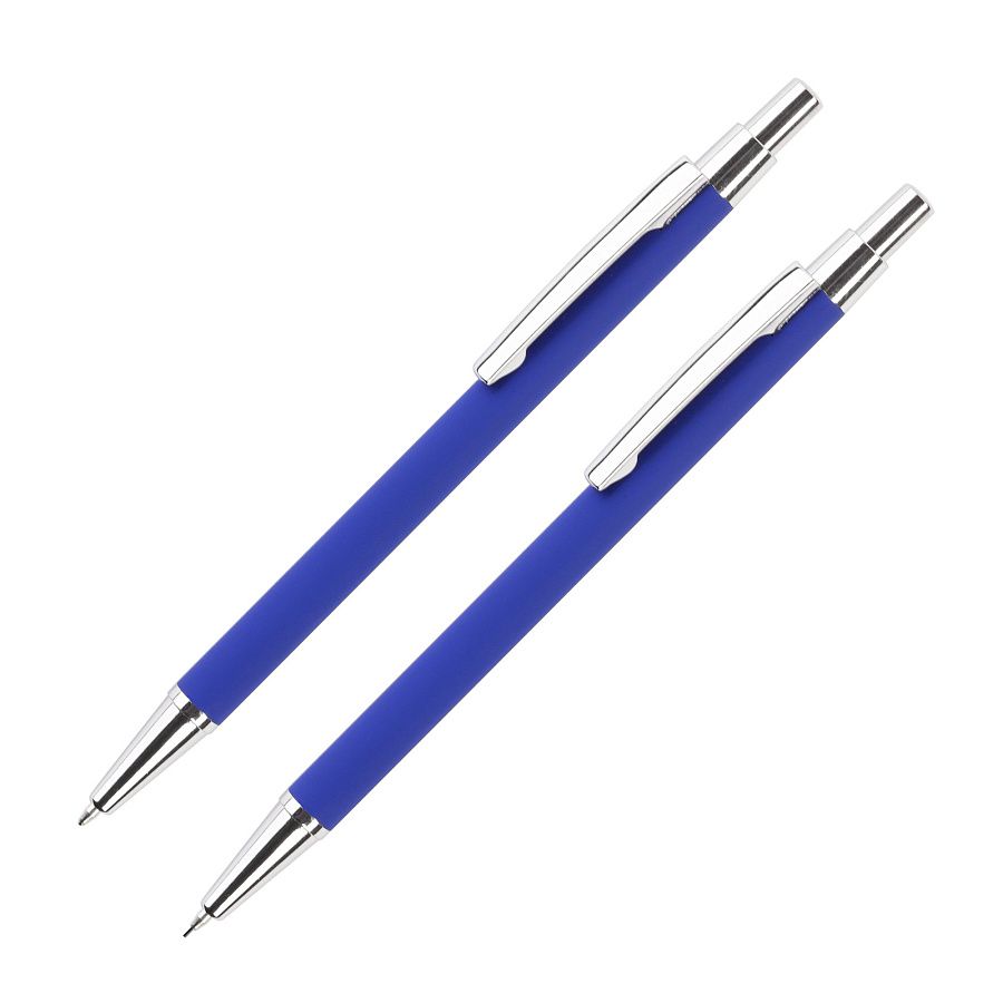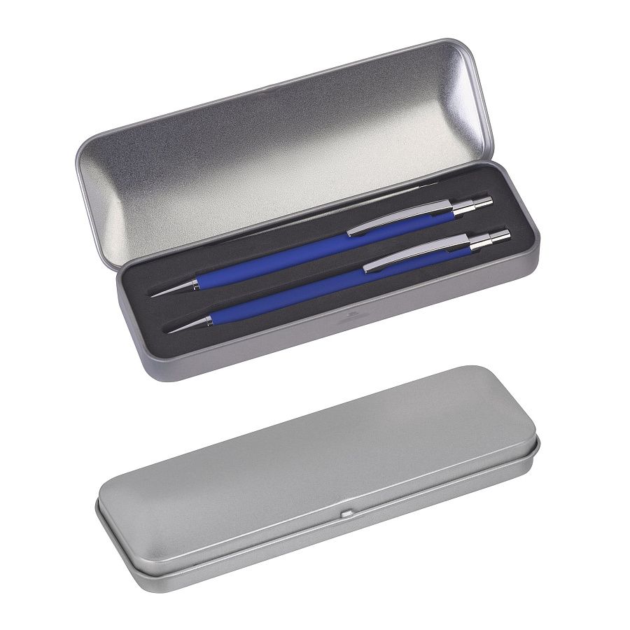 Металлическая ручка и карандаш с корпусом в покрытии soft touch в металлическом серебристом футляре.