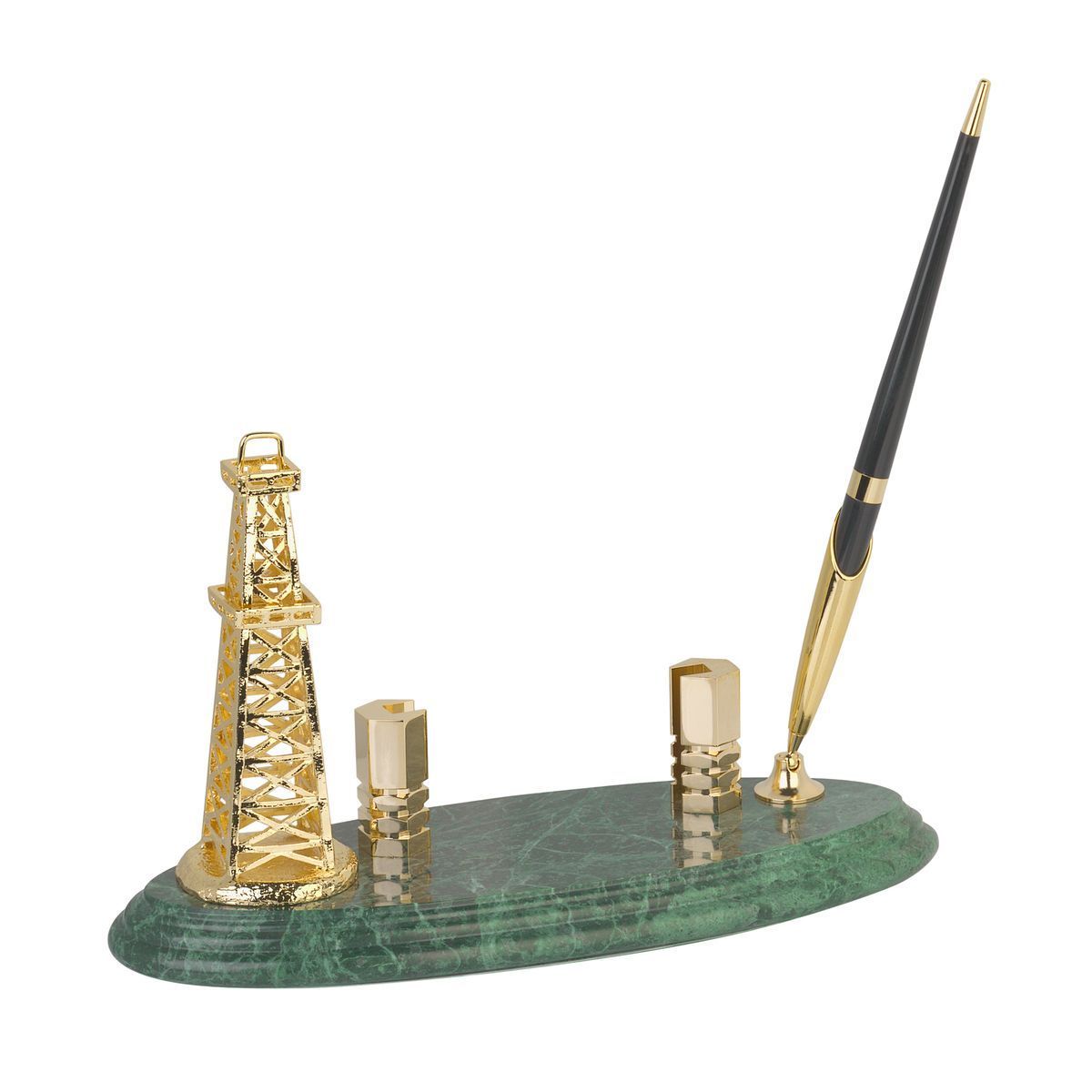 Настольная подставка под визитки с тематическим оформлением «Нефтяная вышка» станет прекрасным дополнением рабочего стола руководителя или директора. Набор украшен фигурой в виде нефтяной вышки, элементы композиции идут с напылением под цвет золота.