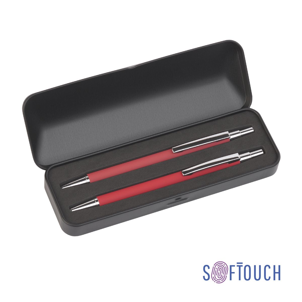 Металлическая ручка и карандаш с корпусом в покрытии soft touch в металлическом черном футляре.