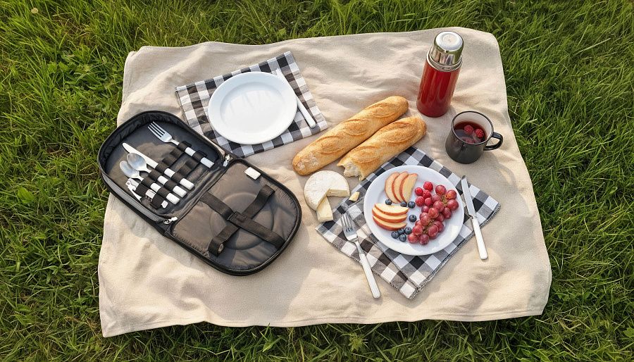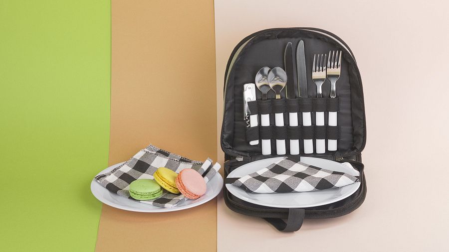 В набор входят: тарелки, ножи сервировочные, вилки, ложки, нож сомелье, салфетки.