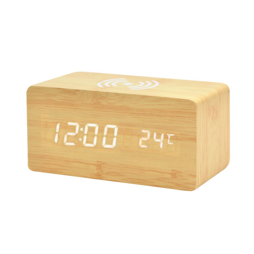 Многофункциональные деревянные часы с белой подсветкой и функцией беспроводной зарядки мощностью 5W. Функции: часы, дата, температура, 3 режима будильника, функция управления звуком (когда данная функция активирована, дисплей гаснет через 15 секунд; вы можете активировать дисплей, хлопнув в ладоши, или слегка постучав по часам). В промежуток времени 18.00-7.00 яркость подстветски снижается на 50%. Источник питания: от сети, либо с использованием 3х батареек ААА (не входят в комплект). Поставляются вместе с русскоязычной инструкцией и USB кабелем для подключения к сети