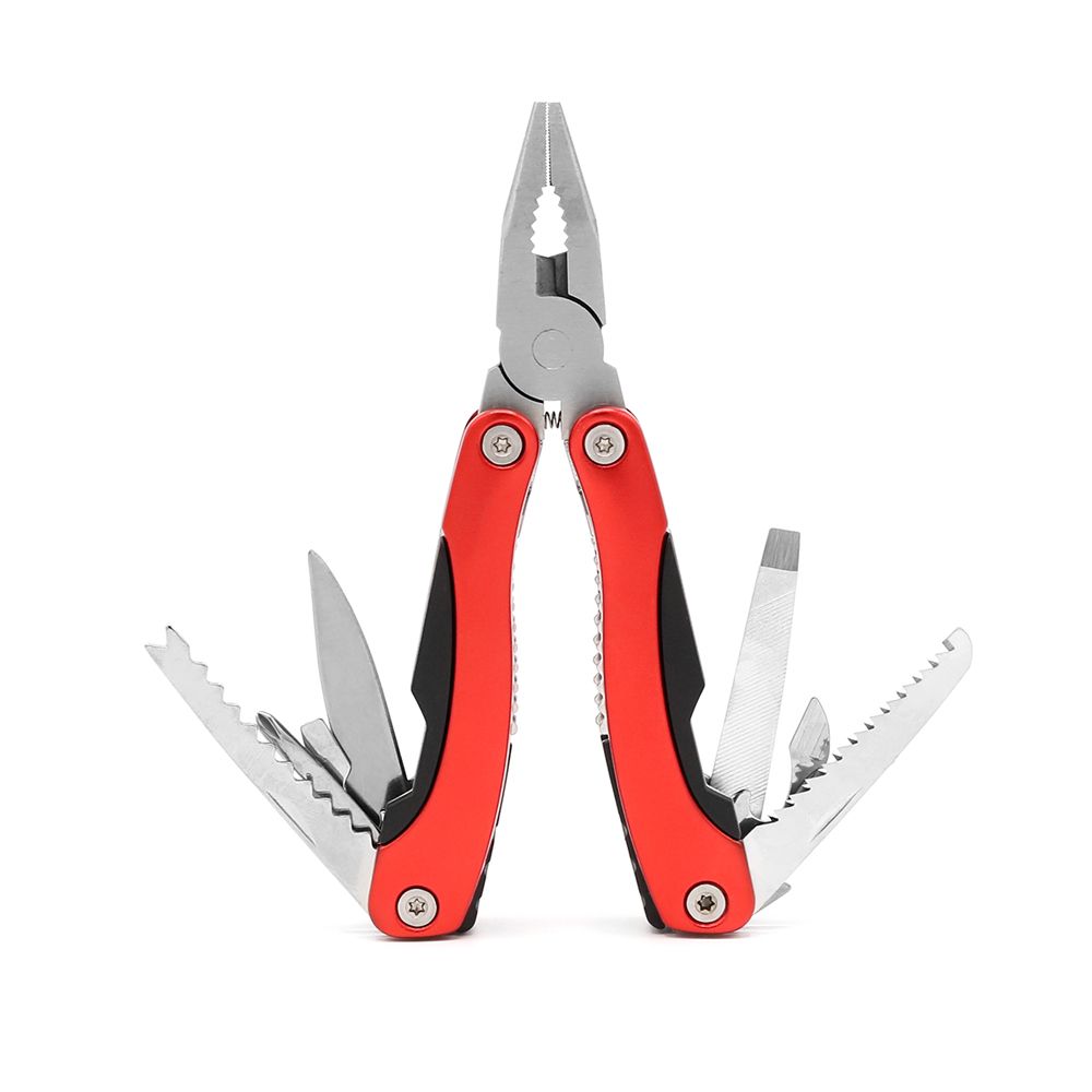 - Функции: Плоскогубцы, Кусачки, Консервный нож, Открывалка для бутылок, Средняя и маленькая плоские отвертки, Крестовая отвертка, Гладкое лезвие, Зубчатое лезвие, Пила, Напильник