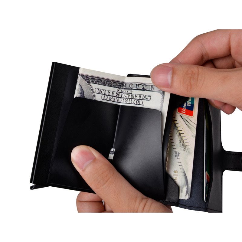 Солидный практичный держатель для банковских карт Bakara с покрытием из экокожи книжного типа и возможностью закрывать, а также функцией RFID, чтобы защитить карты он несанкционированного копирования. Имеет нижнюю кнопку для быстрого извлечения карт.