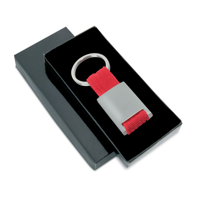 Металлический прямоугольный брелок на ремешке из цветной ткани