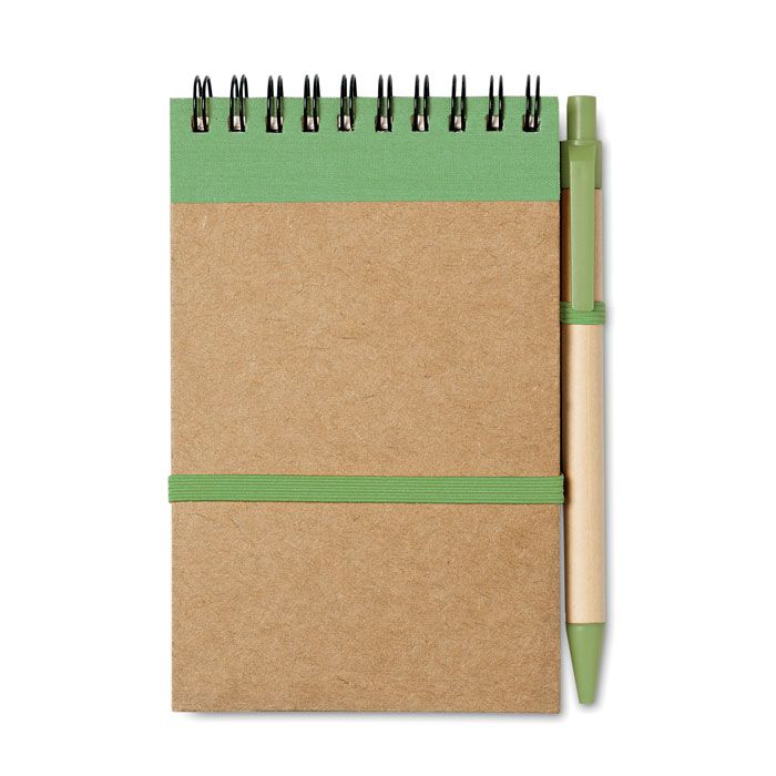 Карманный блокнотик с ручкой. Блок 70 стр. из вторично переработанной бумаги. Застегивается на резинке. Синие чернила.