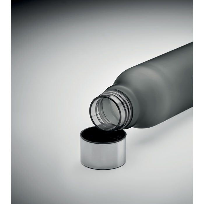 Питьевая пластиковая бутылка (RPET) с прорезиненным покрытием и крышкой из нержавеющей стали и пластика с внутренней стороны (RPET), а также силиконовым кольцом. Полная герметичность. Емкость: 600 мл.Не протекает.