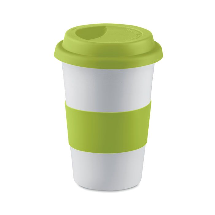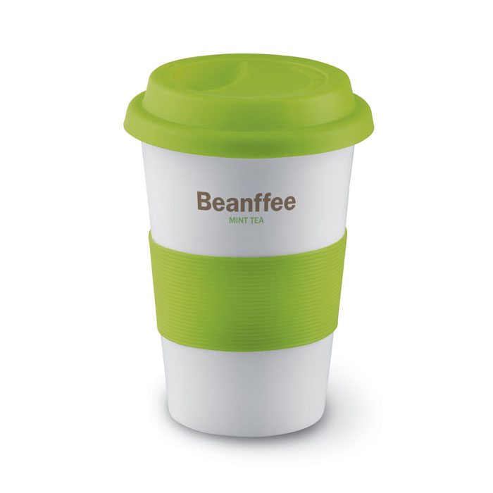 Одностенчатая керамическая кружка с силиконовой крышкой и ободком. Емкость 400мл . Не использовать в микроволновке. Керамотрансфер подойдет для мытья в посудомоечной машине. Поскольку это одностенчатая кружка , осторожно - может нагреваться!