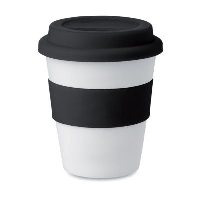 Одностенчатый стакан из блестящего белого полипропилена с силиконовой крышкой и ободком. Емкость 350мл. Поскольку это одностенчатое изделие, осторожно - может нагреваться!