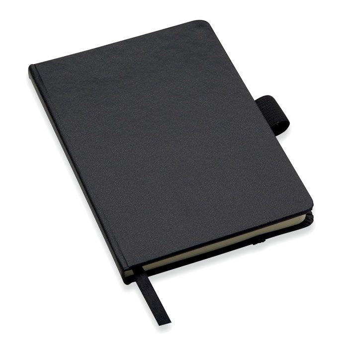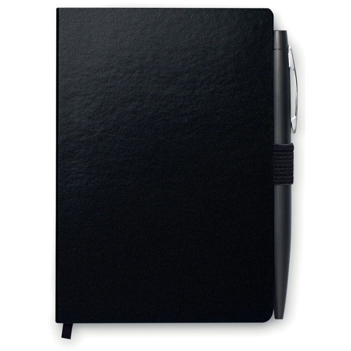 Блокнот A6 с обложкой из картона, 72 линованных листа, с лентой- закладкой, перетянут резинкой. Включает металлическую шариковую ручку с синими чернилами.
