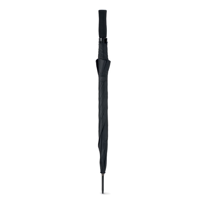 Зонт полуавтомат устойчивый к ветру с черным металлическим стержнем и черной пластиковой ручкой. Длина в сложенном виде 23 см.