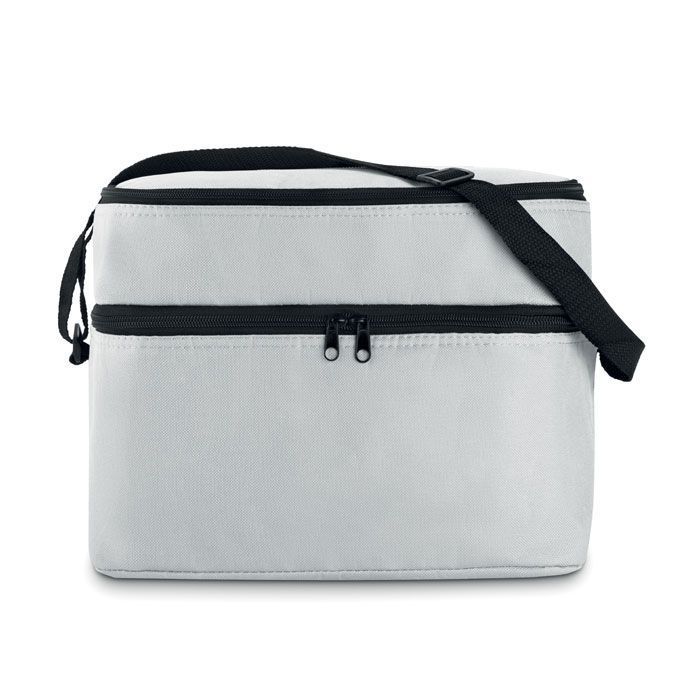 Сумка-кулер с двумя фольгированными изнутри отделениями и регулируемым наплечным ремнем.