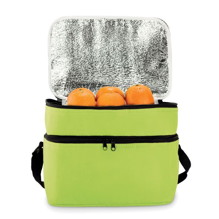 Сумка-кулер с двумя фольгированными изнутри отделениями и регулируемым наплечным ремнем.