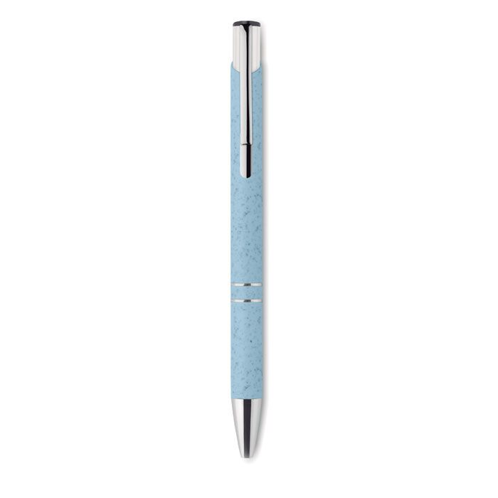Шариковая ручка, состоящая на 50% из соломы и на 50% из пластика с серебряными вставками. Синие чернила.