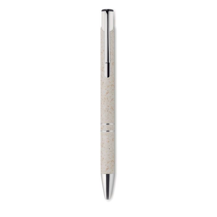 Шариковая ручка, состоящая на 50% из соломы и на 50% из пластика с серебряными вставками. Синие чернила.