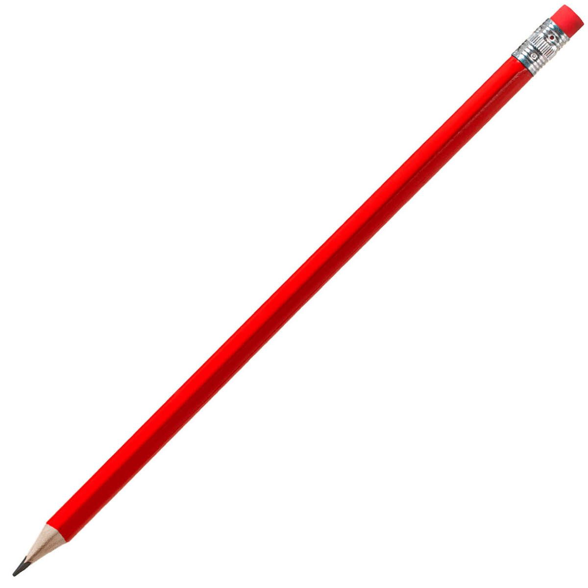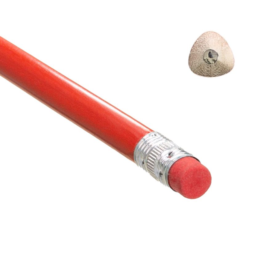 Деревянный карандаш треугольной формы с ластиком в цвет самого карандаша.